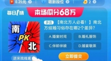 淘宝大赢家每日一猜答案分享来啦!今日问题是和南北方的结婚习俗有关的,答案是A和C。那么,南北方的结婚习俗到底有哪些差异呢?下面为大家带来关于大赢家8月19日答案分享,快